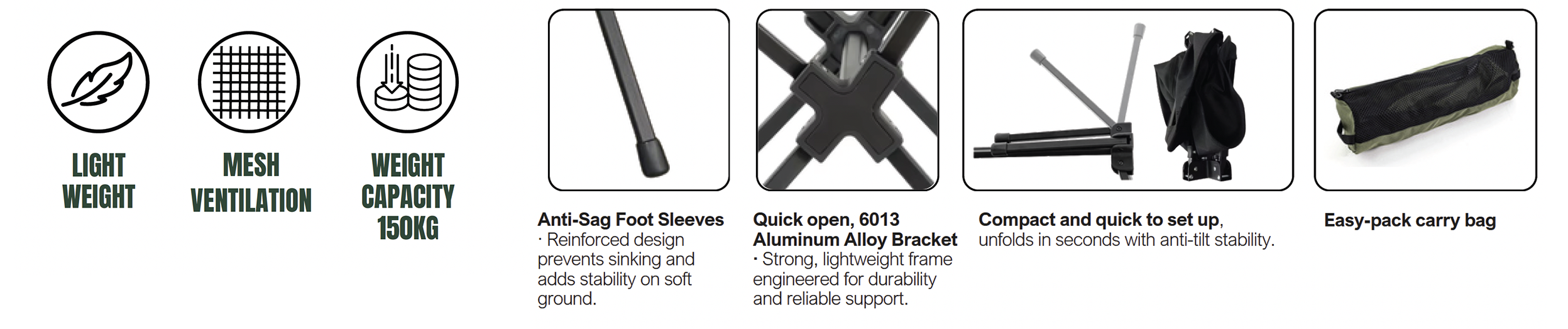 | Key Features | Reinforced 6013 aluminum alloy frame for dependable support The stabilizing crossbar maintains balance on uneven terrain Supports loads up to 150 kg 600D Oxford fabric seat with PU coating for durability Breathable mesh panels for ventilation Lightweight design at only 1.6 kg Folds quickly into a compact, bottle-sized carry bag Integrated cup holder for added convenience Designed for extended outdoor use |